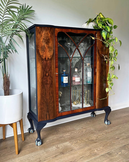 Vintage Art Deco Walnut Glazed Display Drinks Cabinet with Luxurious Velvet Interior - *MADE TO ORDER*